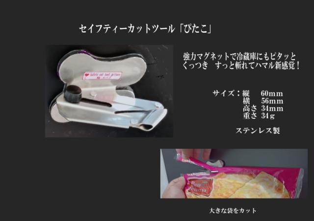 「ぴたこ」はステンレス製で強力マグネット内蔵のコンパクト形状、冷蔵庫やレンジなどの側面に取り 付け、中身の入った大きな袋などをカットします。
