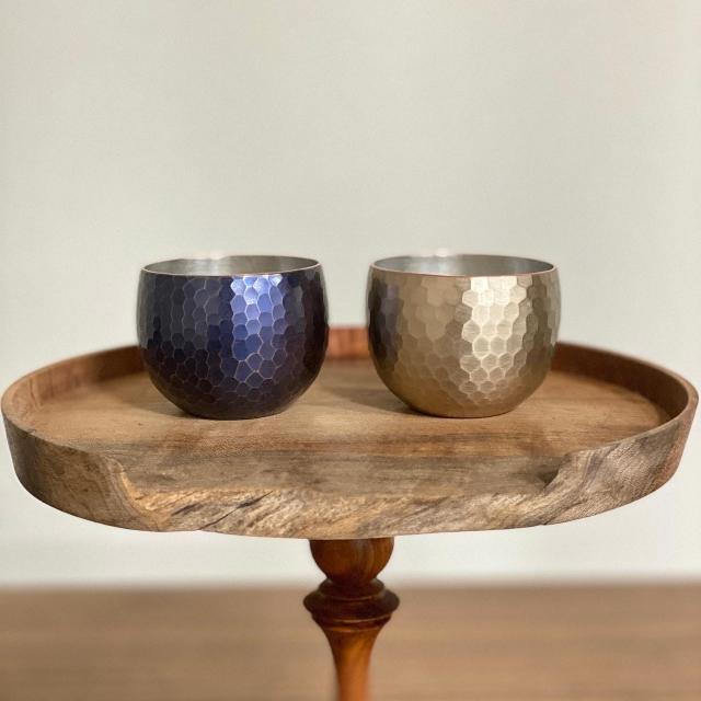 鎚目と呼ばれる金鎚で叩いた跡を模様にした酒器、茶器が中心で、オーダーメイドも可能です。